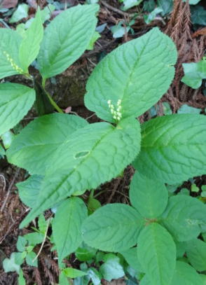 ![]() フタリシズカ 白花を点々と付けた花穂を2本出す、センリョウ科 |